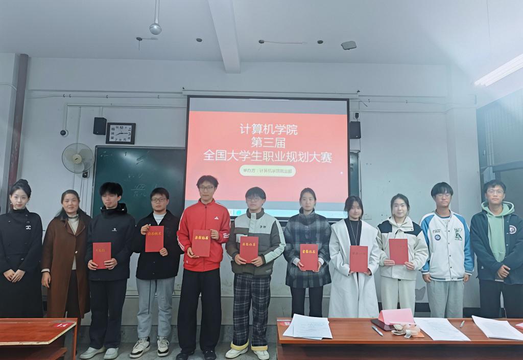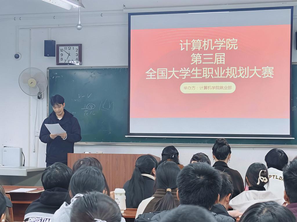 本网消息:为强化高校生涯教育和就业指导,增强大学生职业规划意识,促进高质量充分就业,2025年11月19日,第三届全国大学生职业规划大赛计算机学院专场在 J4-205 教室成功举办。赛事分设成长与就业双赛道,计算机学院辅导员黄晓玲、李雅欣,学生会主席张维新、副主席王嘉安共同担任评委。